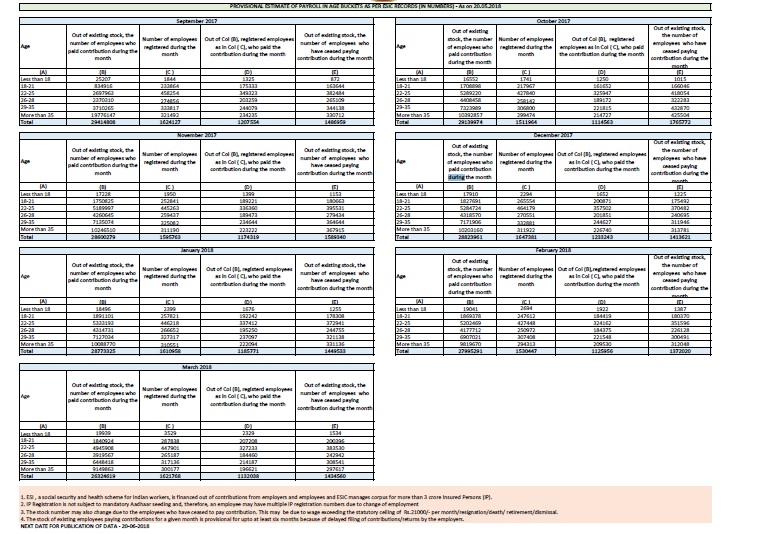 PROVISIONAL ESTIMATE OF PAYROLL IN AGE BUCKETS AS PER ESIC RECORDS (IN NUMBERS) dated 20/5/2018 size:(175.06 KB)